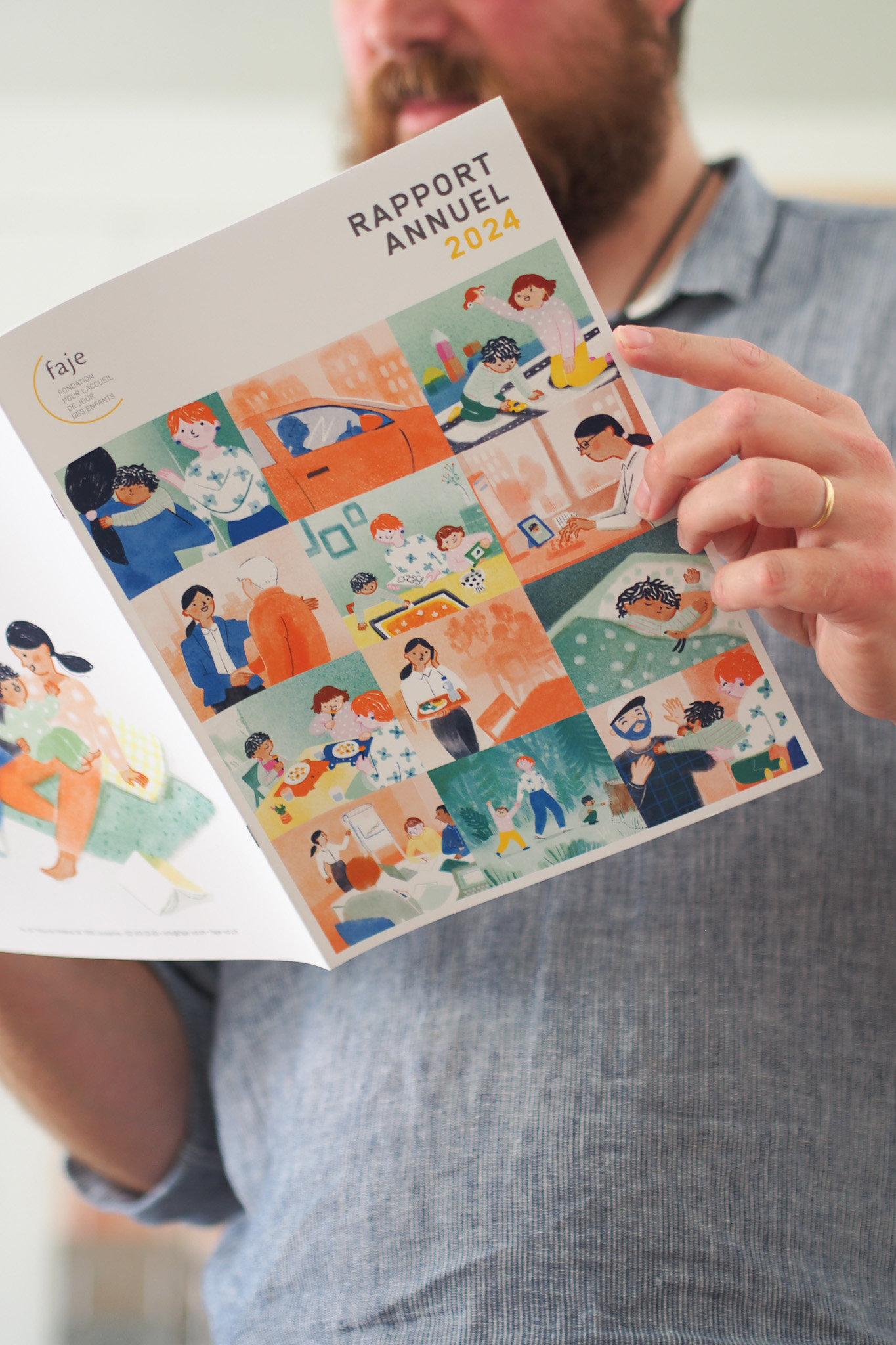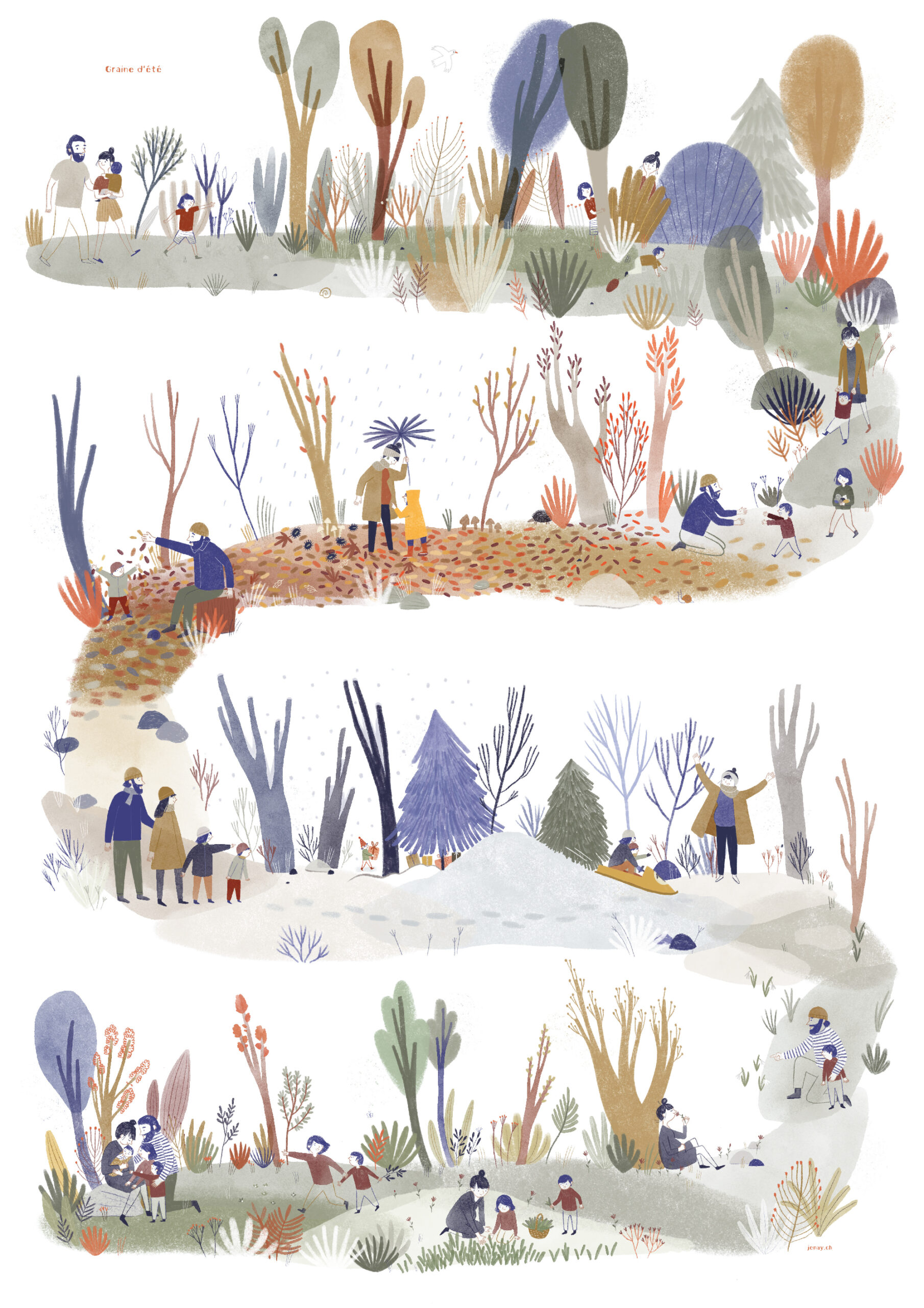 Ses dessins se faufilent d’une brochure à un site, d’un livre à une affiche en passant par les murs, tout en laissant des traces sur son carnet de croquis… Elle est cofondatrice de la maison d’édition Plume et Pinceau, du projet La Bûche fanzine et fonde avec son mari La Batracienne Atelier/Galerie. Ses enfants lui permettent de garder un pied (ou deux) dans le monde de la créativité et de la fantaisie créant l’équilibre avec le statut d’indépendante qu’elle cultive depuis 2011.