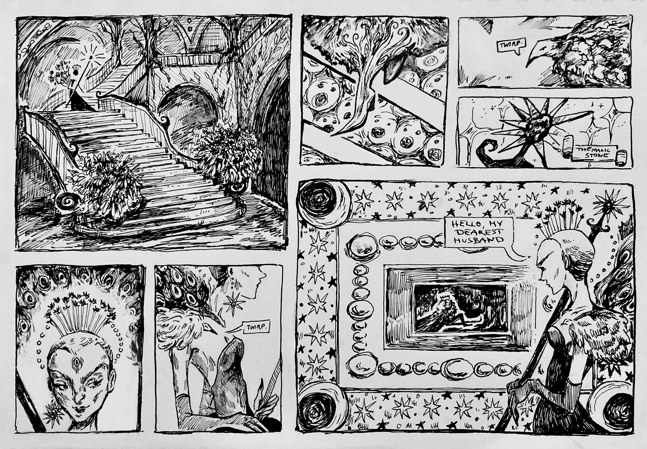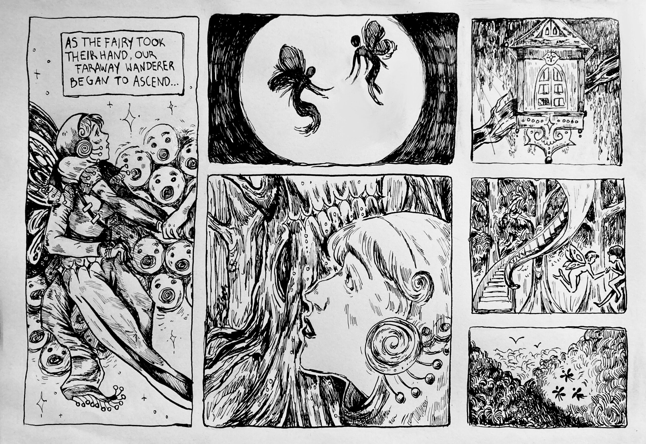 Thaïs Zanghi is an illustrator from Lausanne whose work explores spirituality found in nature, the spirits and magical creatures that inhabit it, and the idea of metamorphosis. She experiments with different types of media, such as watercolor, acrylic, and pencil, but her current favorite technique is ink, which she uses to work on her graphic novel project „Wanderlings.“ Although she is comfortable with digital art, she remains attached to traditional techniques and meticulously detailed works. Artists Arthur Rackham and John Bauer, among others, are major inspirations. She would like to contribute to the book industry by creating cover illustrations or fully illustrated editions of literary works. Thaïs is also interested in design projects for products or magazines.